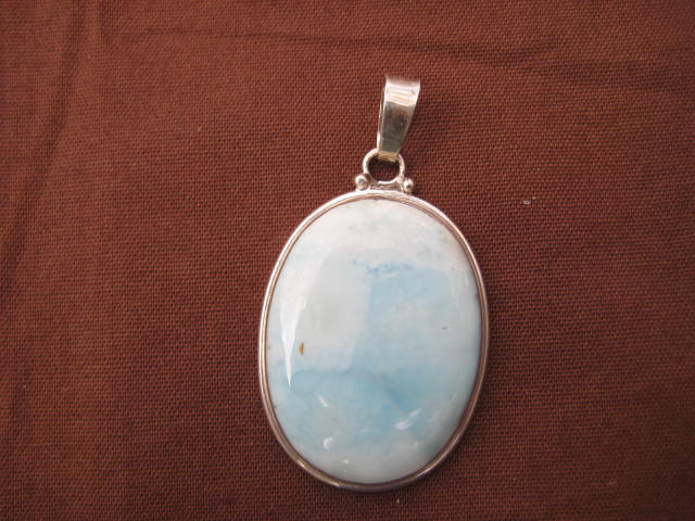 Larimar Pendant(Sterling Silver) comes only from the island of Hispaniola, in the Carribean Sea. Weight: 10g(3/8oz) Dimensions: 1 1/4"x 1 1/8"x 1/4"(3 1/2cm x 2 1/2cm x 1/2cm) Larimar stone is trememdous benefit to the throat chakra. Providing the power of clear communication and the emotional strength and stablility that enable one to speak from the heart.