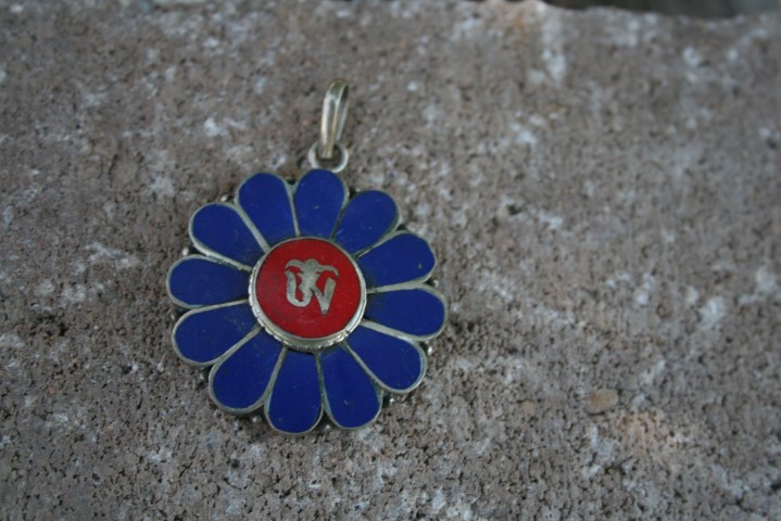 Tibetan 'Om" Pendant is from Nepal. Has Genuine red coral and Lapis stones. Is gold plated. Weighs:3/8oz(13grams) Diameter: 3 3/4cm(1 1/2")(diameter and without bale) In all Hindu art and all over India and Nepal, 'om' can be seen virtually everywhere, a common sign for Hinduism and its philosophy and theology. Hindus believe that as creation began, the divine, all-encompassing consciousness took the form of the first and original vibration manifesting as sound "OM".